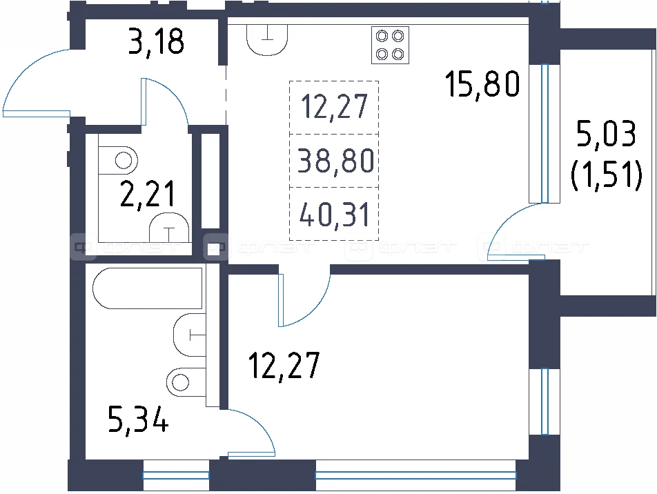 - 40.31/12.27/15.8 м²