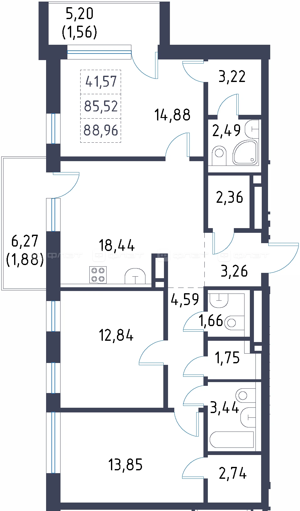 - 88.96/41.57/18.44 м²